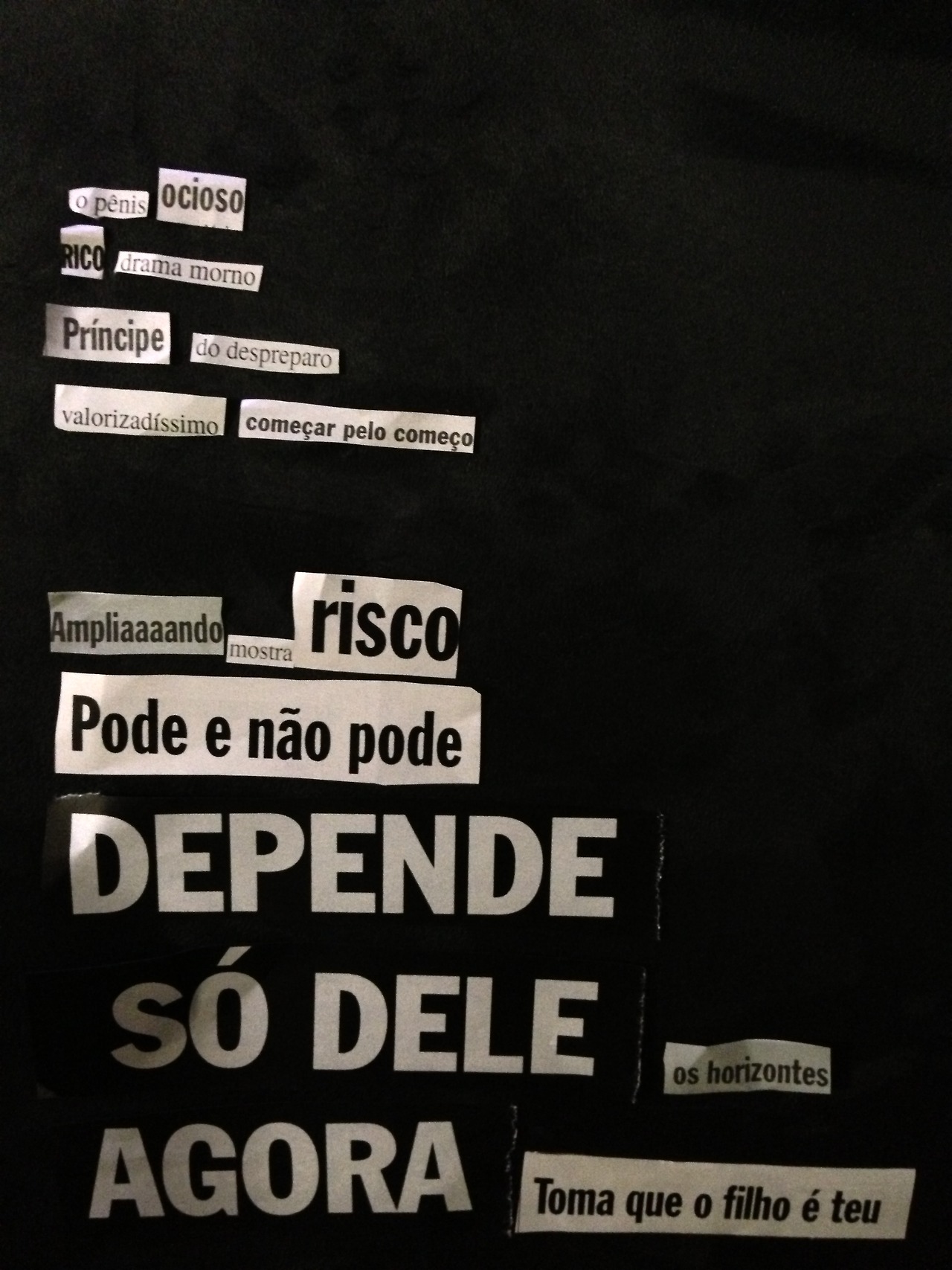 Com alguns retoques, um aparada aqui, uma repicada ali, a gente poderia manter esse relacionamento. Pensei nos meus amores. A primeira coisa que veio: poesia. Era isso. Abri a revista e recortei todas as frases de impacto que pude encontrar e tentei criar relação entre elas. Qualquer coisa que fizesse sentido. O resultado virou até um tumblr:
